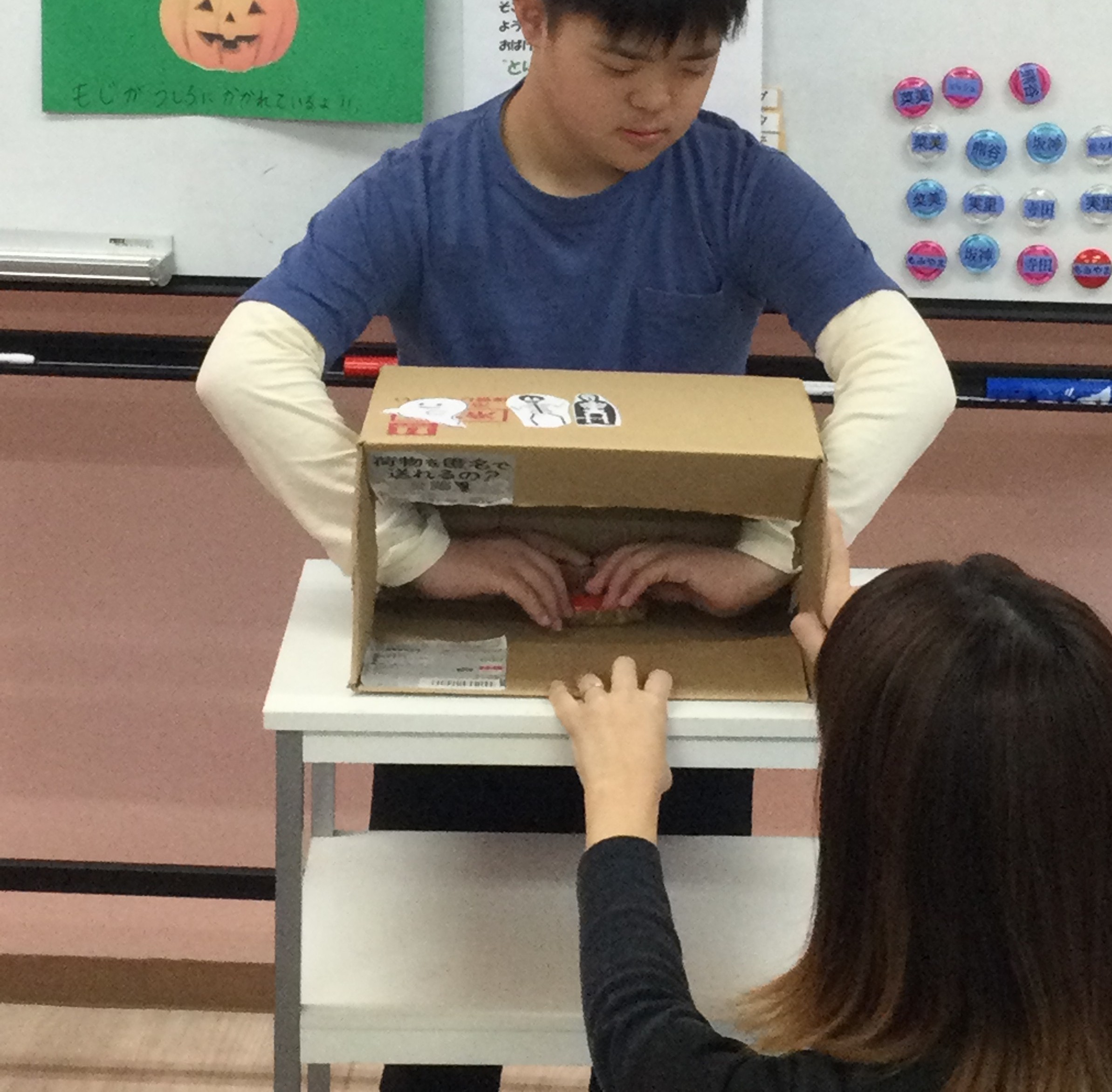 次は事業所の中に隠されているカボチャを探します!後ろに文字が書いてあるので、それを繋げておばけの居場所が分かります!