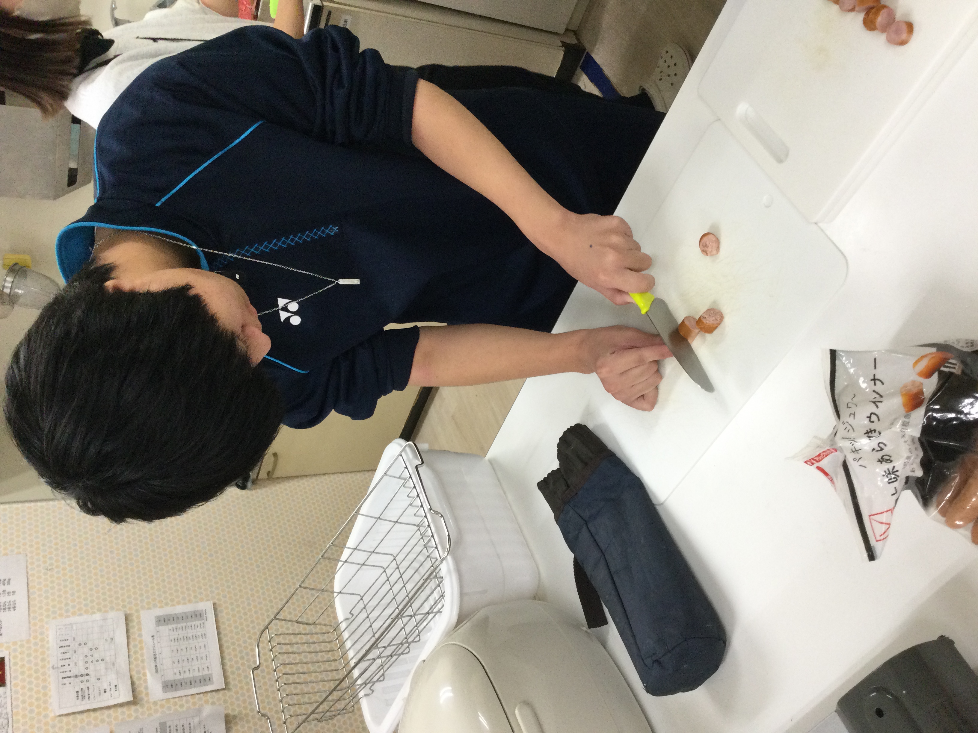 包丁でソーセージを切っています!