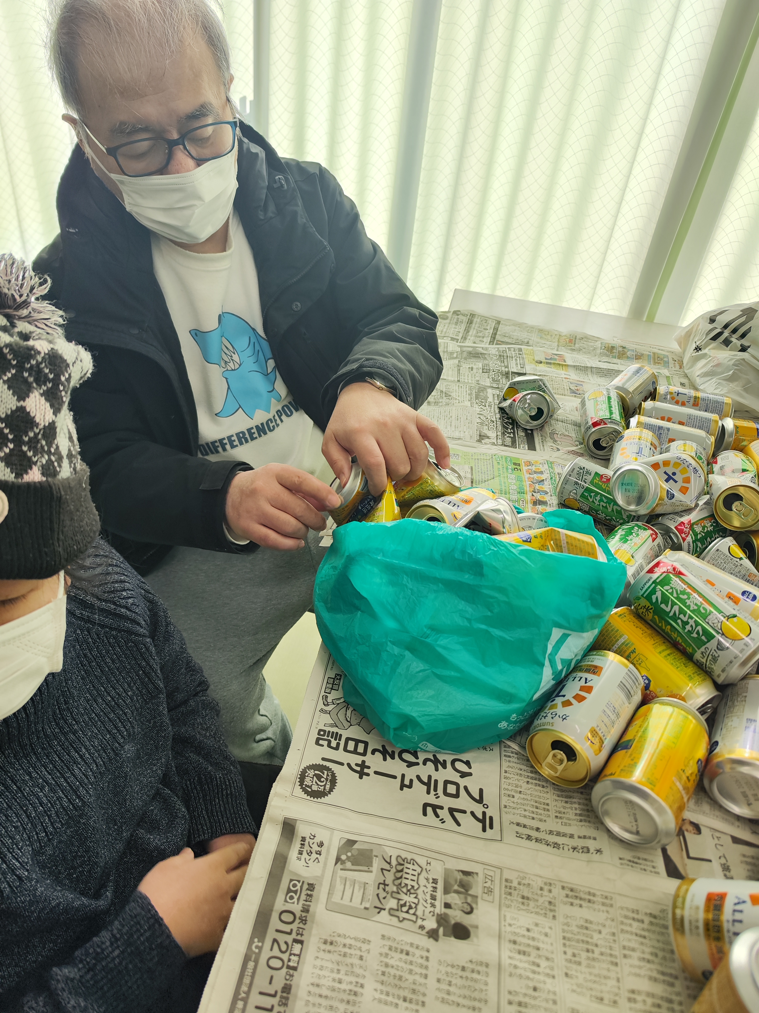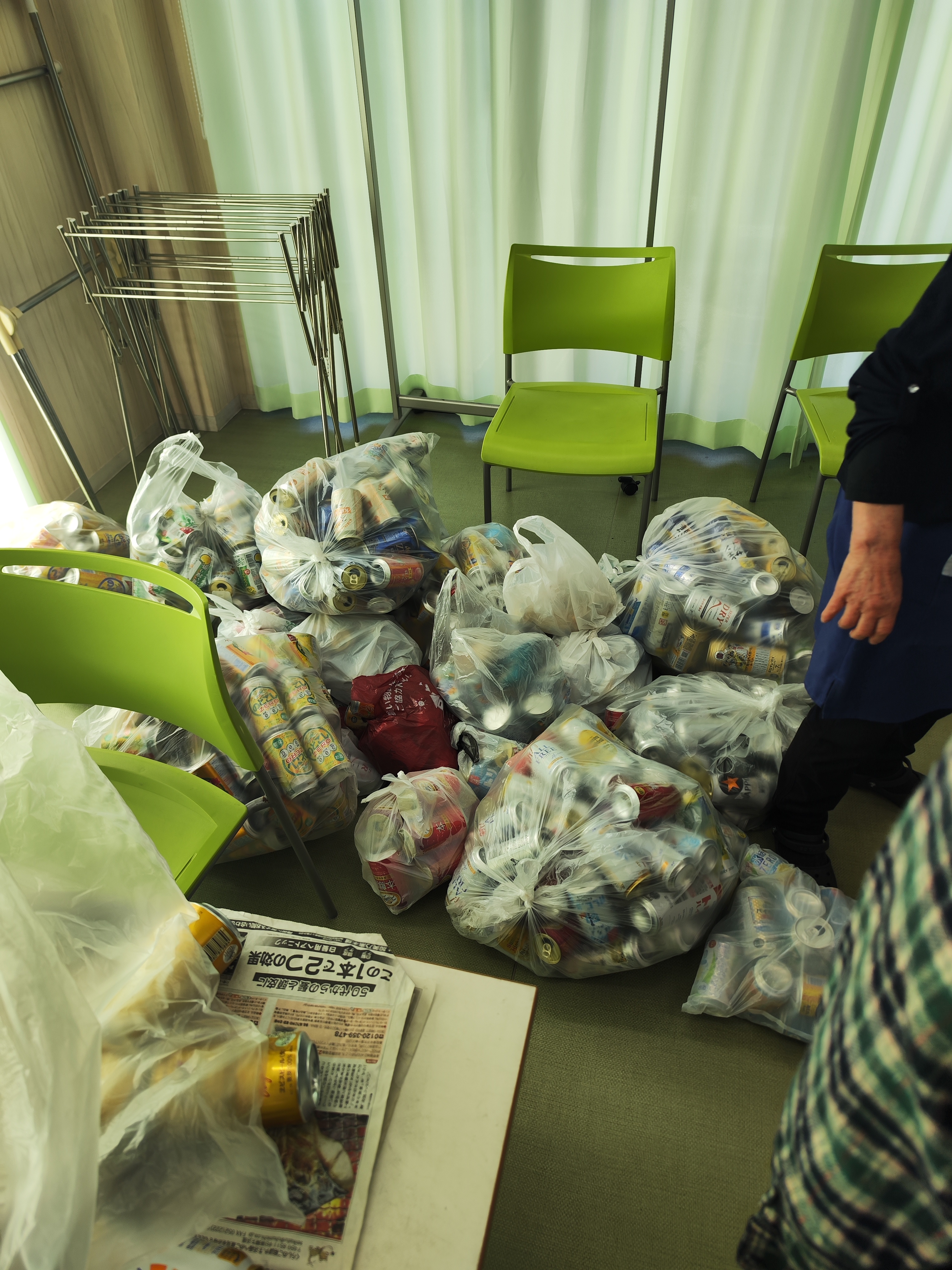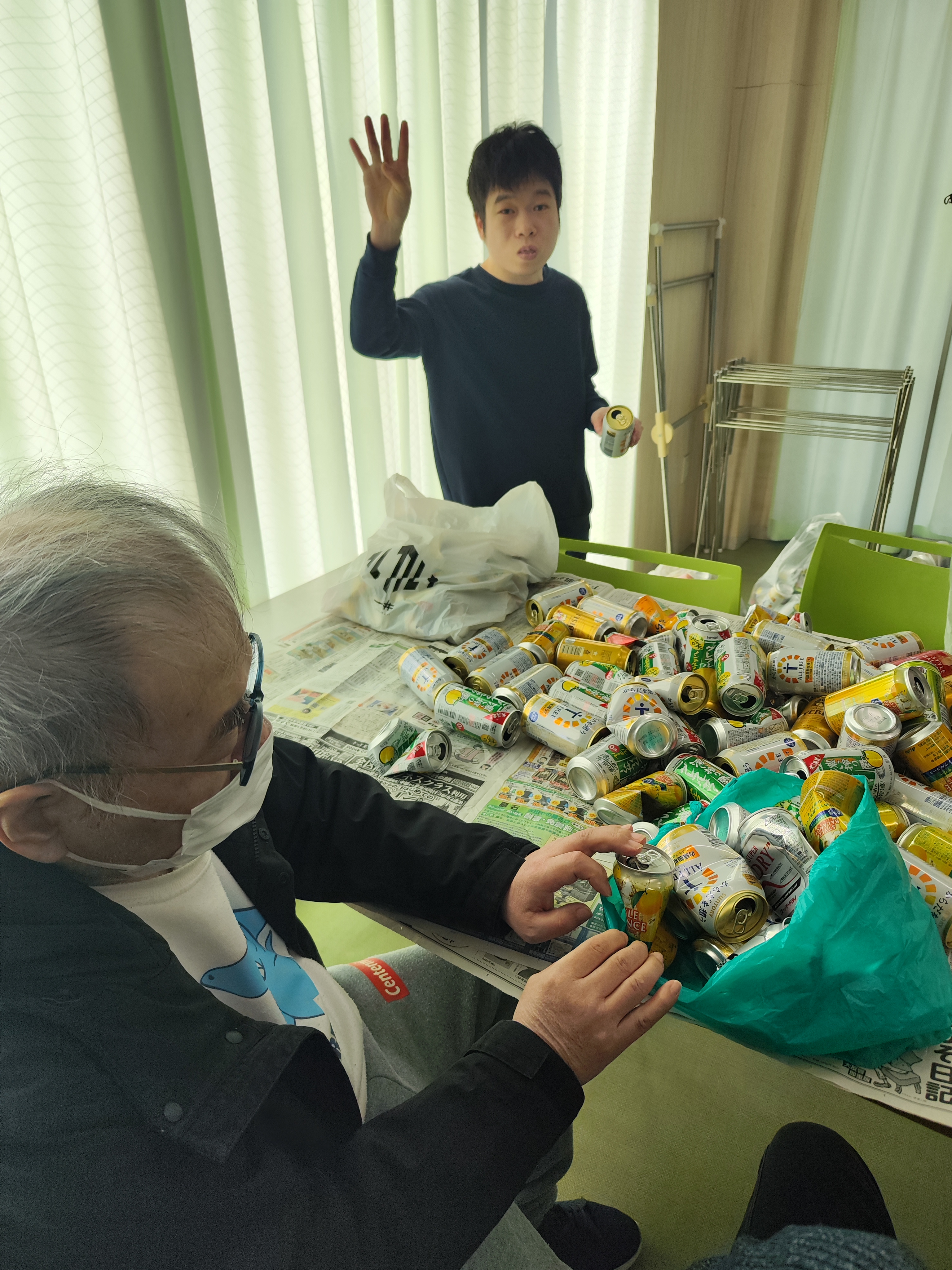 いただいた空き缶は、利用者さんの大切な工賃作業として活用させていただきます。