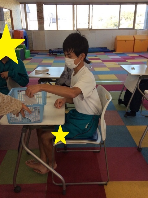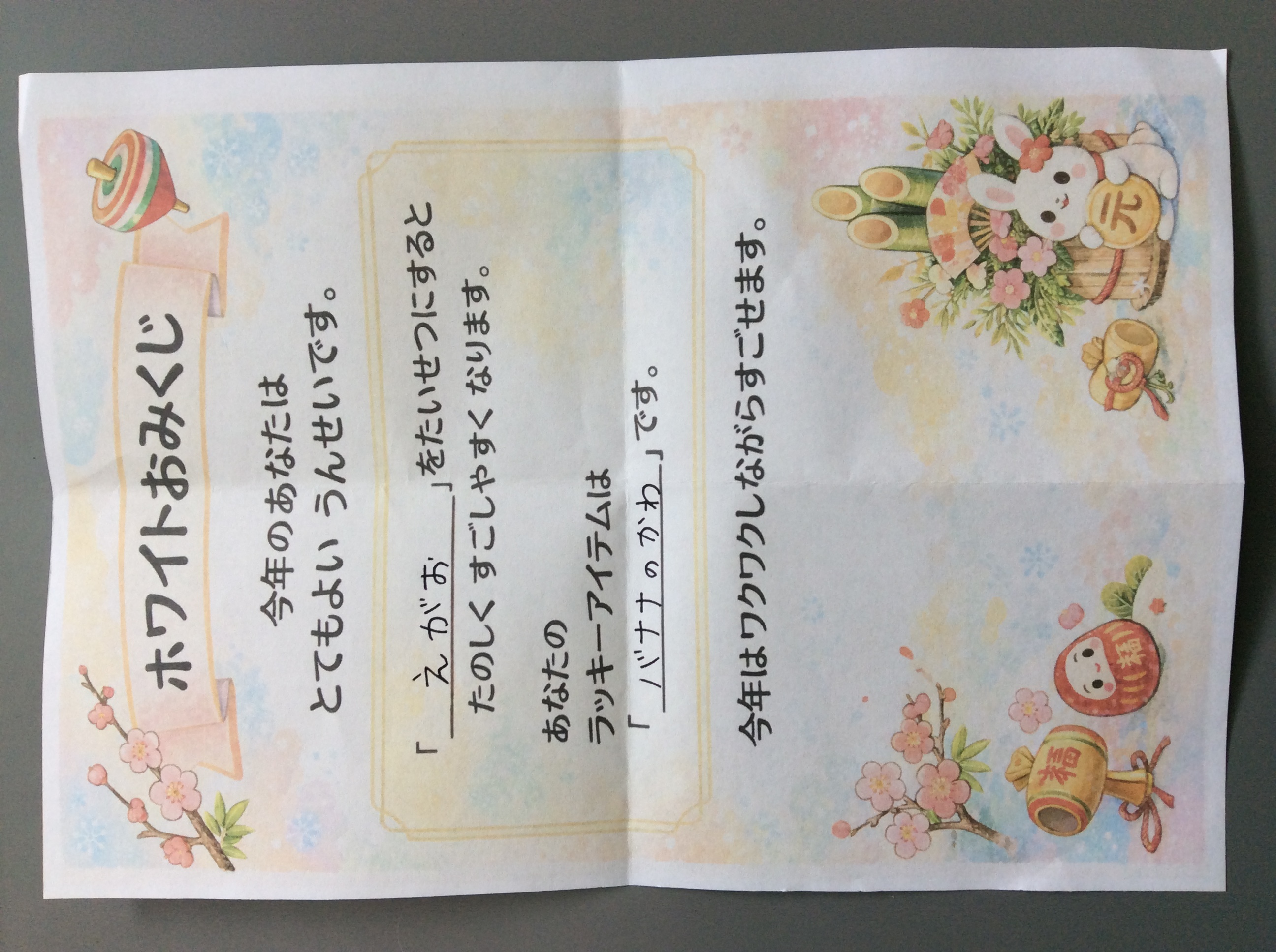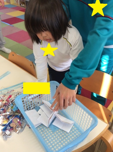 みんなには下の写真のように「大切にするものやこと」と「今年のラッキーアイテム」の欄にそれぞれ言葉を書き込んでもらい、その後一人ずつおみくじのようにかごから引いてもらいました(*^-^*)